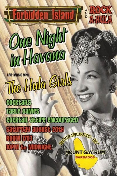 We take the party to the tropical playground of Havana, circa 1950. Rum flowed and tourists and locals alike flocked to the Tropicana, "the most beautiful nightclub in the world" We'll transport you to those heady days with first class cocktails, table games and live music by The Hula Girls! Cocktail attire strongly encouraged!